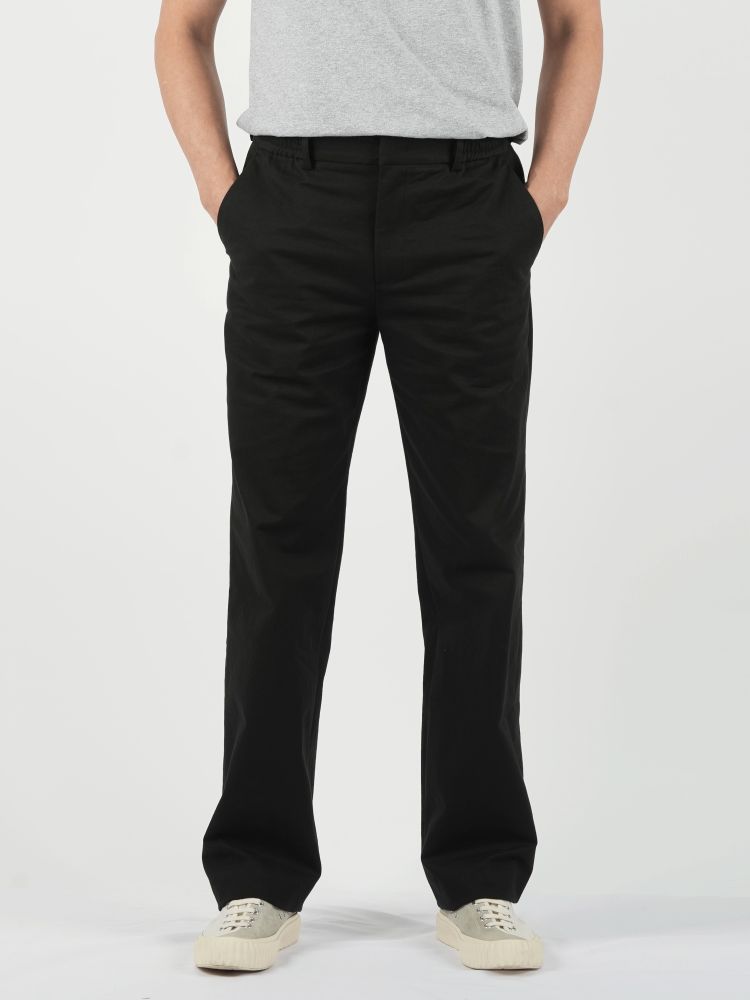 편안한 허리밴딩 스타일, 면바지의 편안함과 스판의 신축성으로 장시간 착용에도 부담 없음.